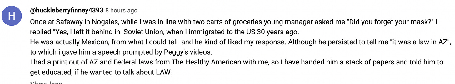 There are numerous other instances I won’t get into. I was always the only one not complying everywhere I went. I am chronically ill and this battle fatigued me tremendously. Your responses will help me going forward. The one that was the most difficult to take on was “this is a private business and private property”. Honestly these pea brains couldn’t figure out if they’re open to the public they’re not private. They aren’t a PMA.