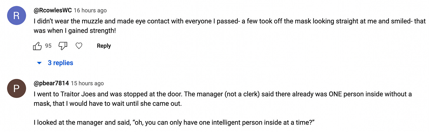 “Why don’t you make the ones wearing the dangerous germ-filled masks stay outside, since they are the ones living in fear? They are the ones that need the accommodation, not me.”