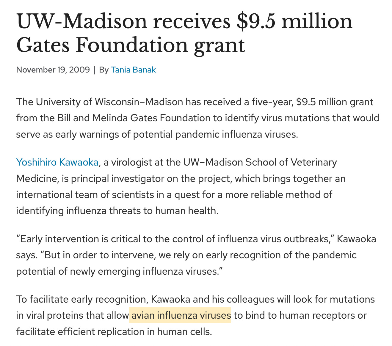 Meanwhile, years ago the University of Wisconsin–Madison pocketed $9.5 million from the Bill and Melinda Gates Foundation to identify virus mutations that could signal the next pandemic — specifically avian influenza.