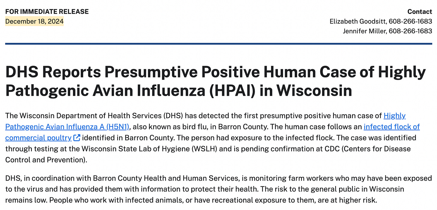 The Wisconsin Department of Health coincidentally had their 'positive' human case of bird flu on December 18th, too. Oops, my bad—presumptive positive. Guess they were in a rush to hit the headlines in sync with the CDC before the lab results were even finished. You know, maybe they’re just amplifying those tests a little to make sure they definitely get a positive result. Better safe than presumed sorry!