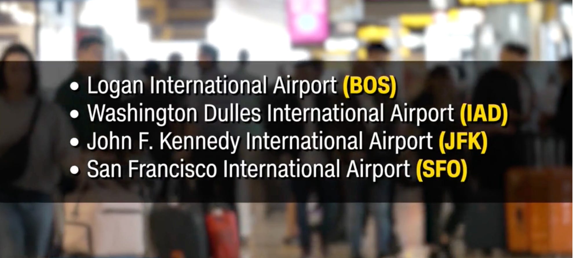 The big airports rolling this out include Dulles International Airport in Washington, D.C., Boston Logan International Airport, San Francisco International Airport, and John F. Kennedy International Airport in New York.