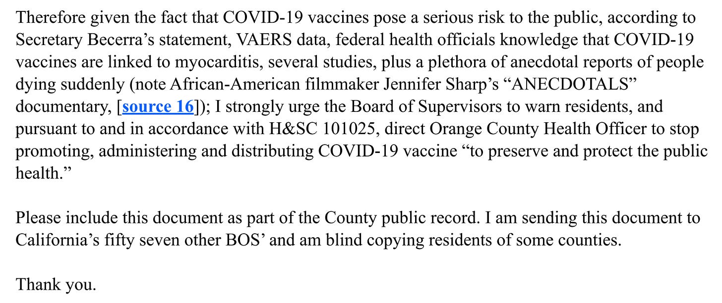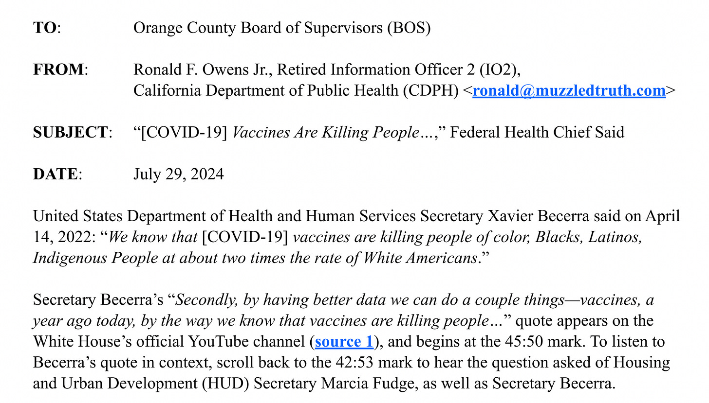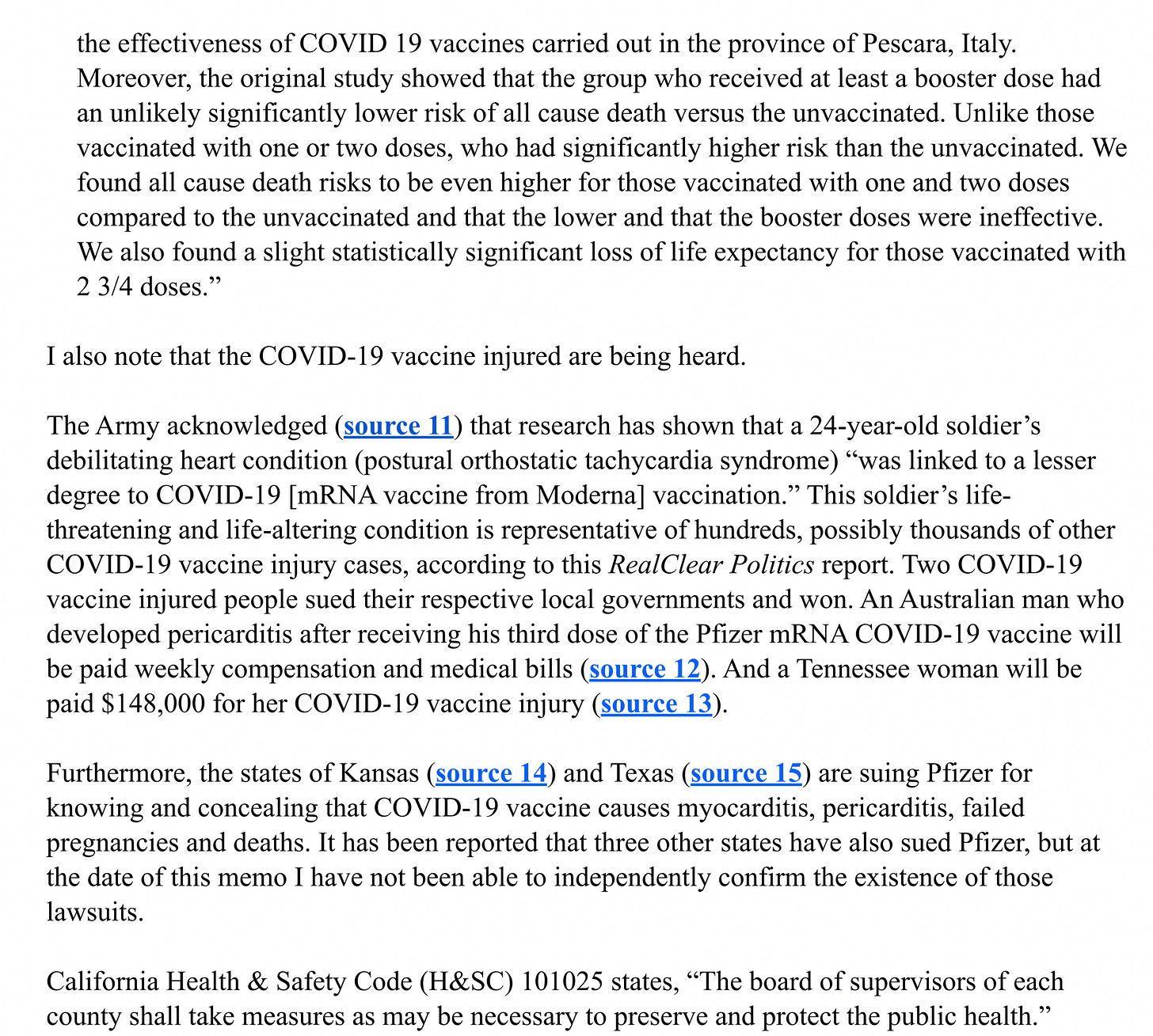 Ronald emailed me a recent communication that he sent to all 58 county boards of supervisors in California, alerting them that under CA law 101025, these boards are required to take measures to protect the public health — and Ronald interprets this as the necessity to immediately publicize the harms of the Covid 19 shots and to stop promoting, distributing and administering them.