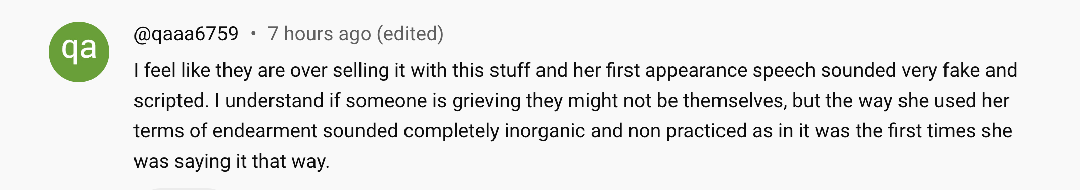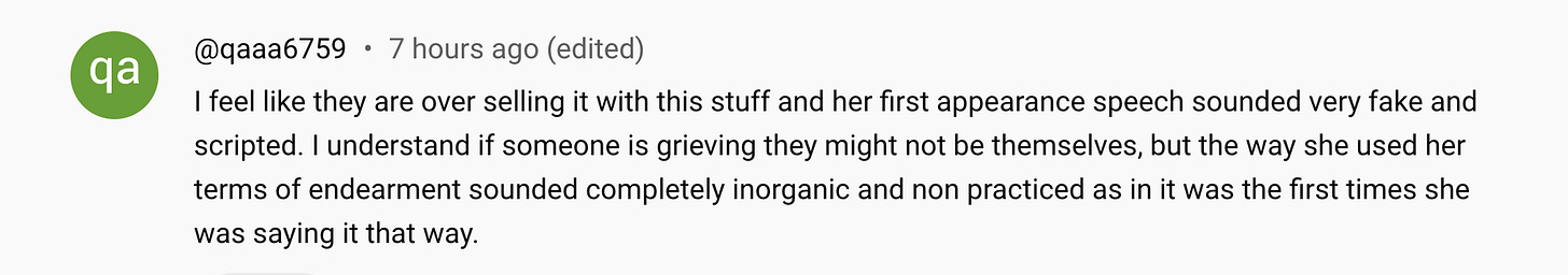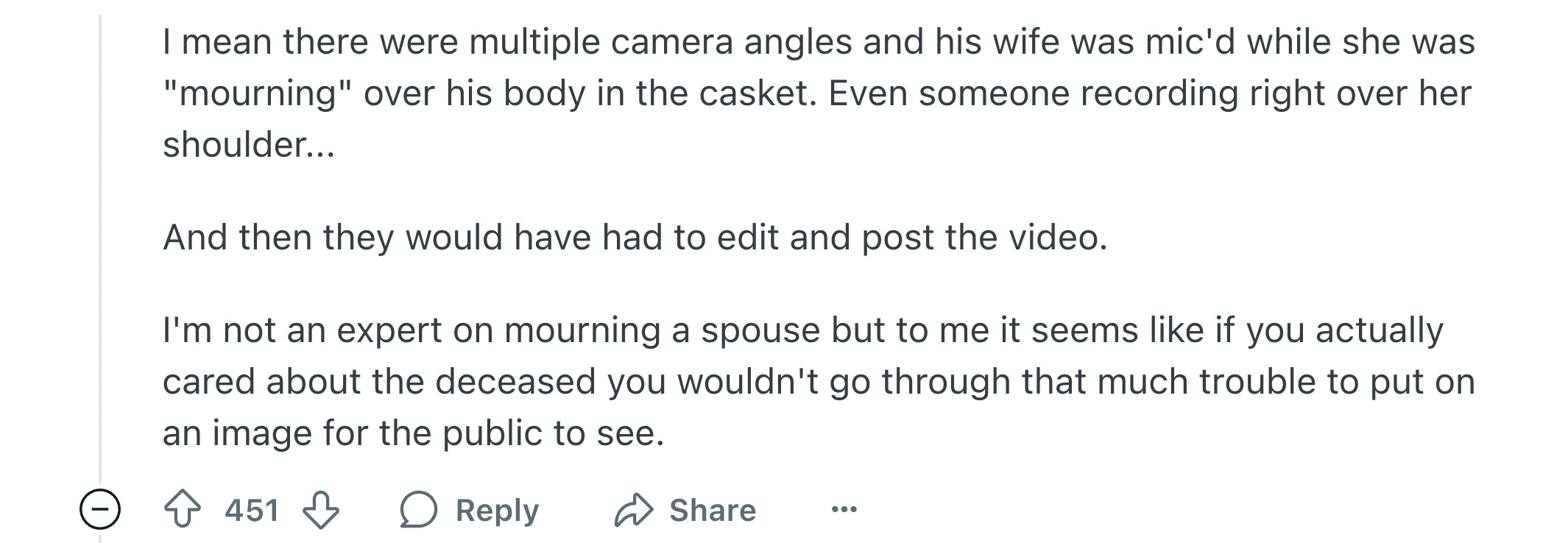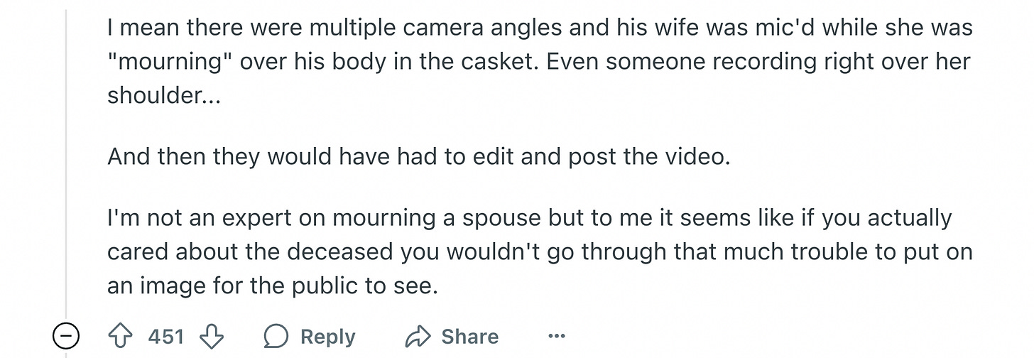 👉 For someone who wants to keep her personal life private, why get mic’d up and ask someone to film you caressing your husband’s corpse while flashing your gold jewelry and long fingernails, whispering and generally doing something that should be kept out of the view of cameras.