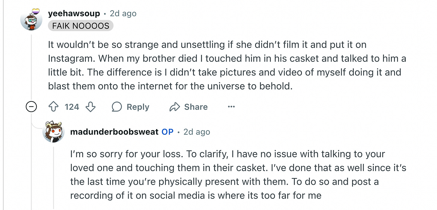 Needless to say, there’s a disconnect with the photos of her over the casket. Many people have photos of them paying their final respects. She may want it as a keepsake, but what I do find odd is posting it publicly because she herself is so private.