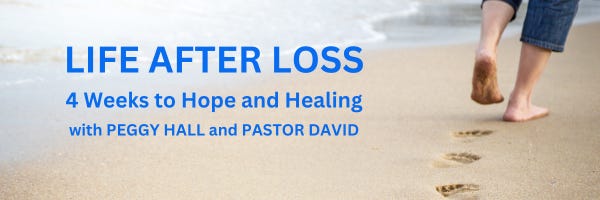 Note: You do not have to be a Christian or a person of faith to participate in the Life After Loss program. All are warmly welcomed. Peggy and Pastor David are not psychologists or licensed therapists. They are here to provide a caring, supportive environment for grieving individuals to provide empathy, prayer and practical tools for healing.