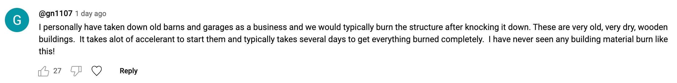 Then there's the bizarre aftermath. The cars on the left are melted and obliterated—like they were in a furnace—while the ones on the right look relatively untouched. How is that even possible? What factors could explain fire behavior like that? Especially with strong winds. How in the non-spinning world could those cars be incinerated yet the trees next to them not be burnt to a crisp?