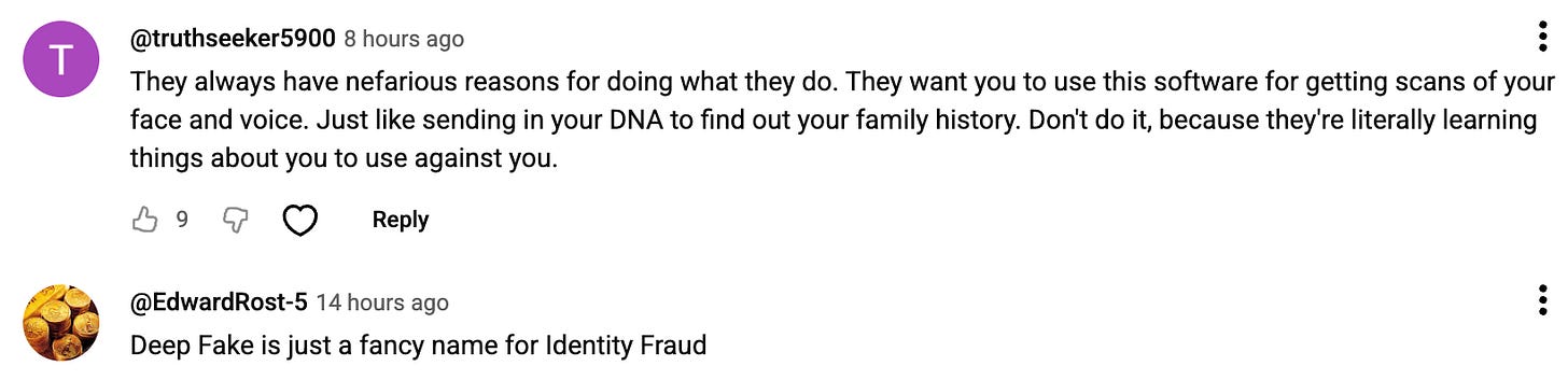 I’m assuming deepfakes exist in this legal gray zone because most were originally used for “entertainment” — think satire or film editing. But in my book, that’s still deception.
