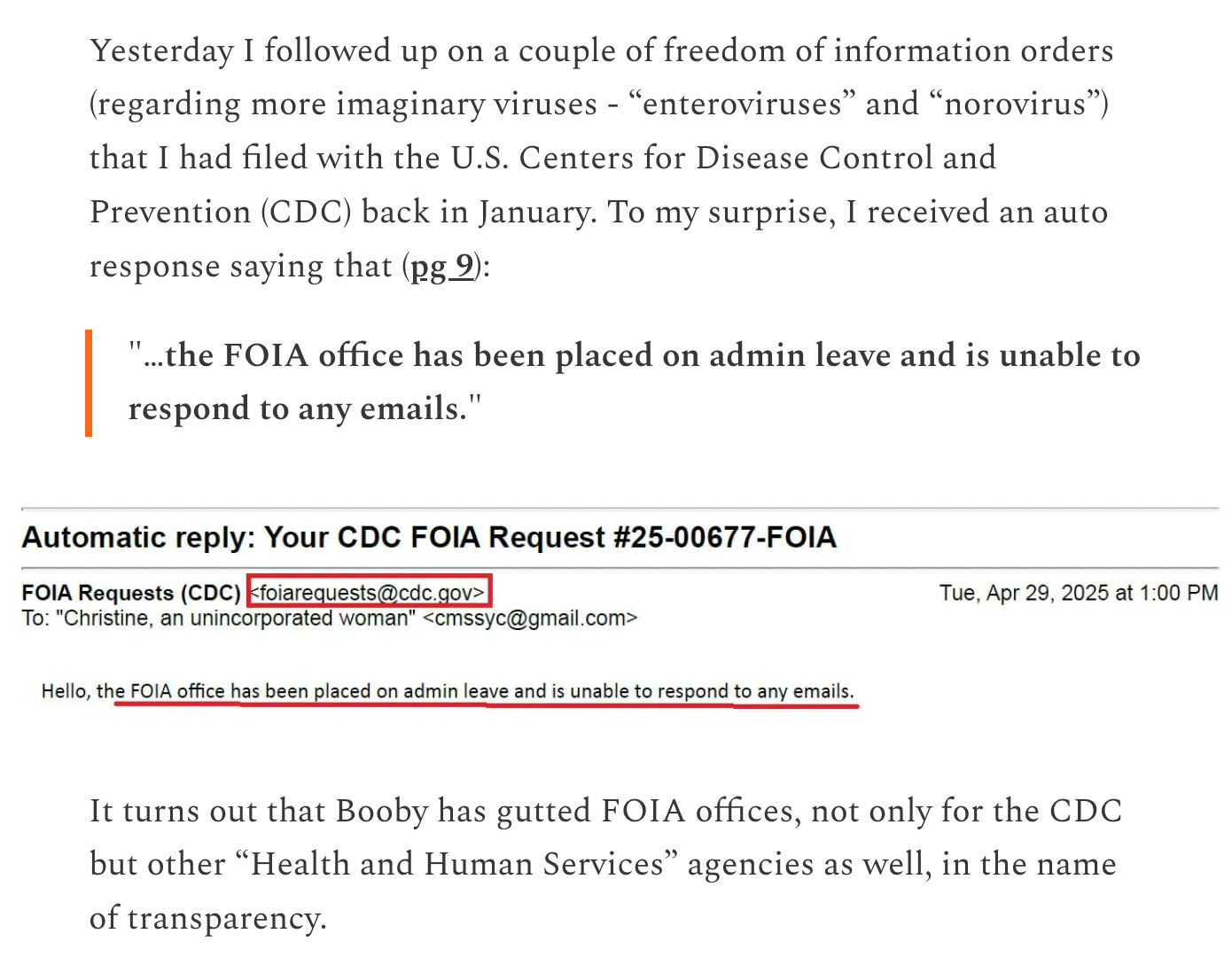 …But Bob’s FOIA offices are on leave, not only for the CDC, but for other Health and Human Services agencies as well—all supposedly in the name of transparency.