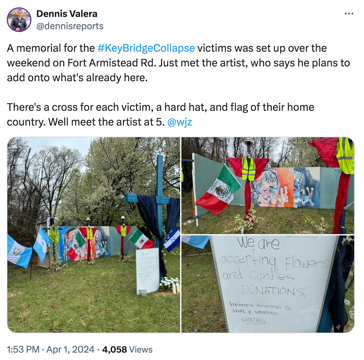 I did find images of the memorial going on for the workers who lost their lives in the Key Bridge collapse. Did you see that image? I'll link the twitter post below. It's quite strange. It looks like little scarecrows, with the hard hat and their reflective uniform. What I find interesting is that there's no American flag. Is that just me? But there's the flag of Mexico, one is the flag of El Salvador, and the other one is Honduras.