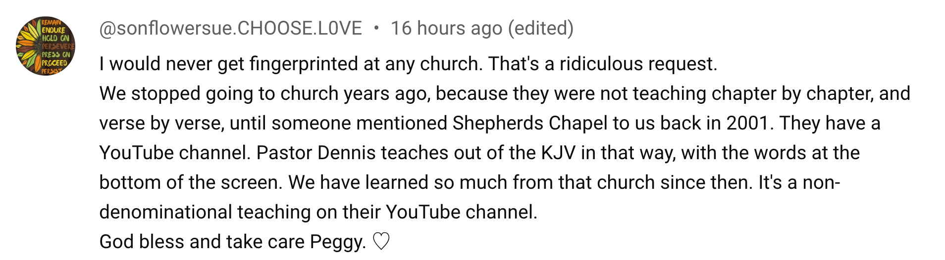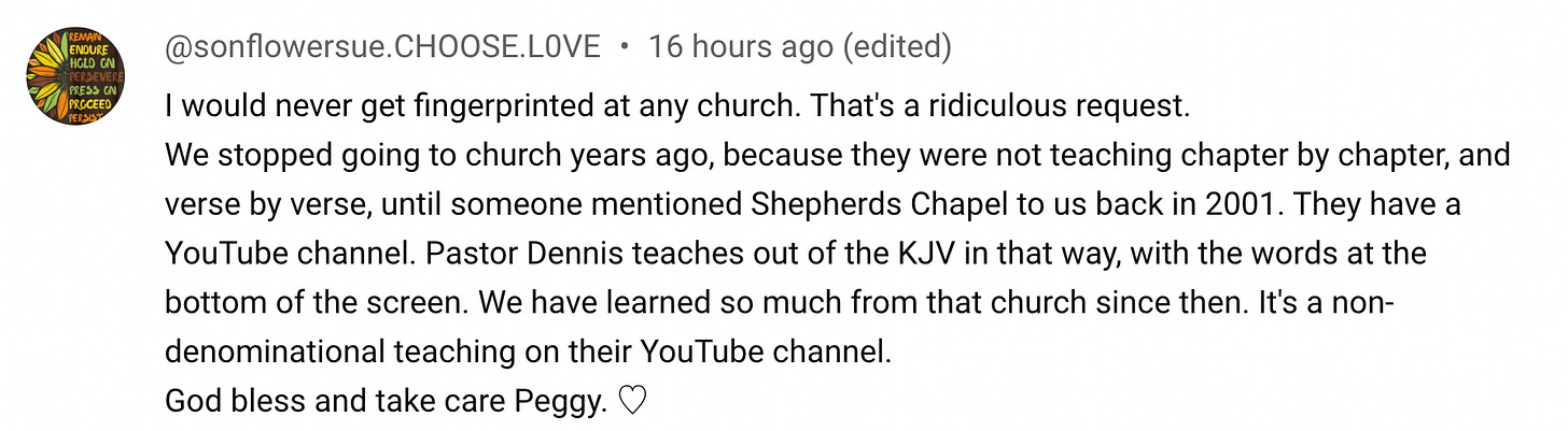 Recently, a Healthy American couple wrote to me about a new requirement from their church which I share in my video above (11:50). They are greeters at their church in Southern California and were asked to get fingerprinted. They had no issue with fingerprinting in their previous jobs as flight attendants but felt it was unnecessary for a volunteer greeting position. They didn't want the government to know where they attended church and saw no need for fingerprinting when they weren't working with children.