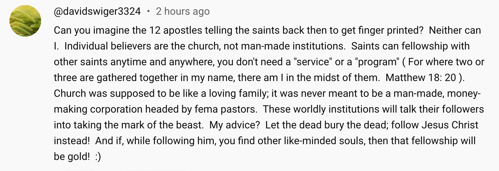 I look forward to hearing from Pastor Kemble in the next private webinar. I also highly recommend Pastor Chuck Baldwin of Liberty Fellowship - he live streams every Sunday and has a huge back catalog of sermons to listen to for free online. And his Organization and Beliefs statement says it all: