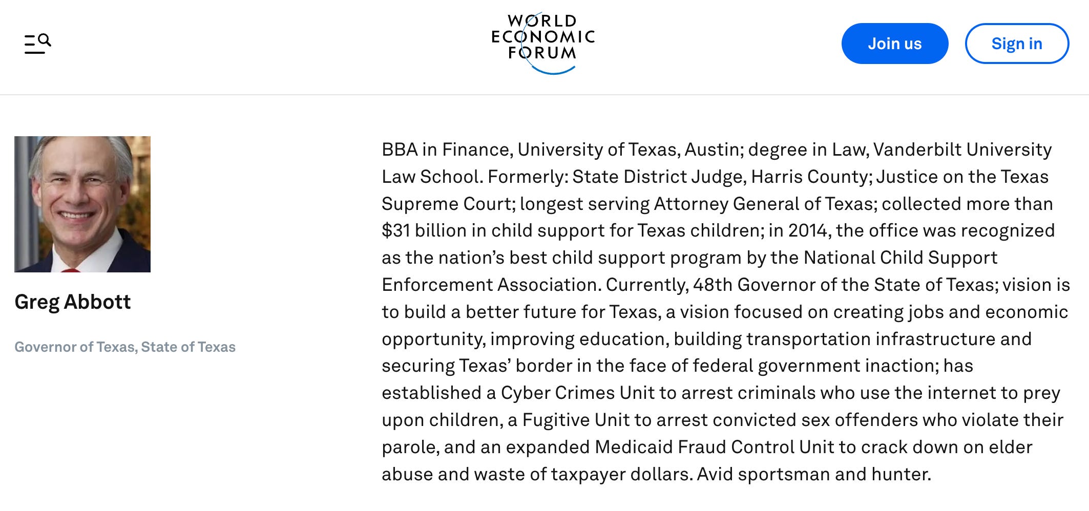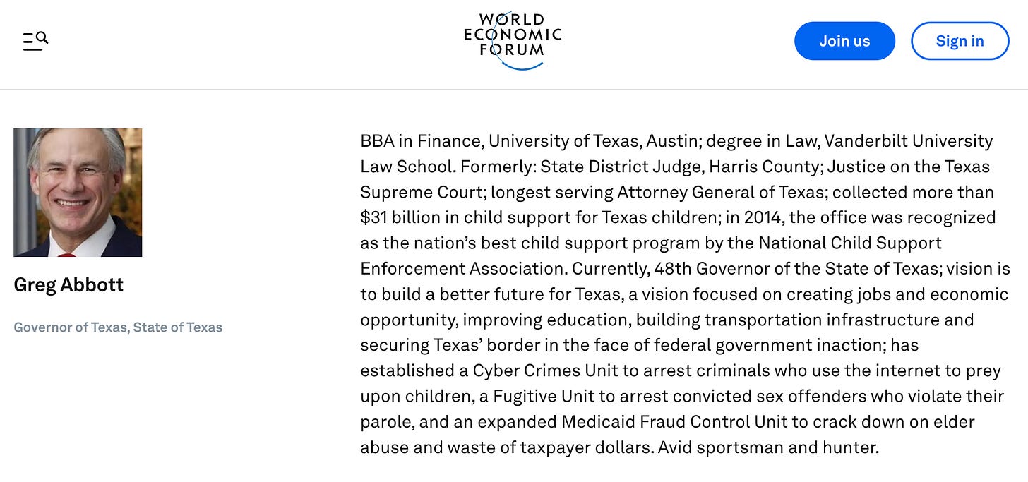 And of course I shared in my previous substack that Greg Abbott is a WEFer.