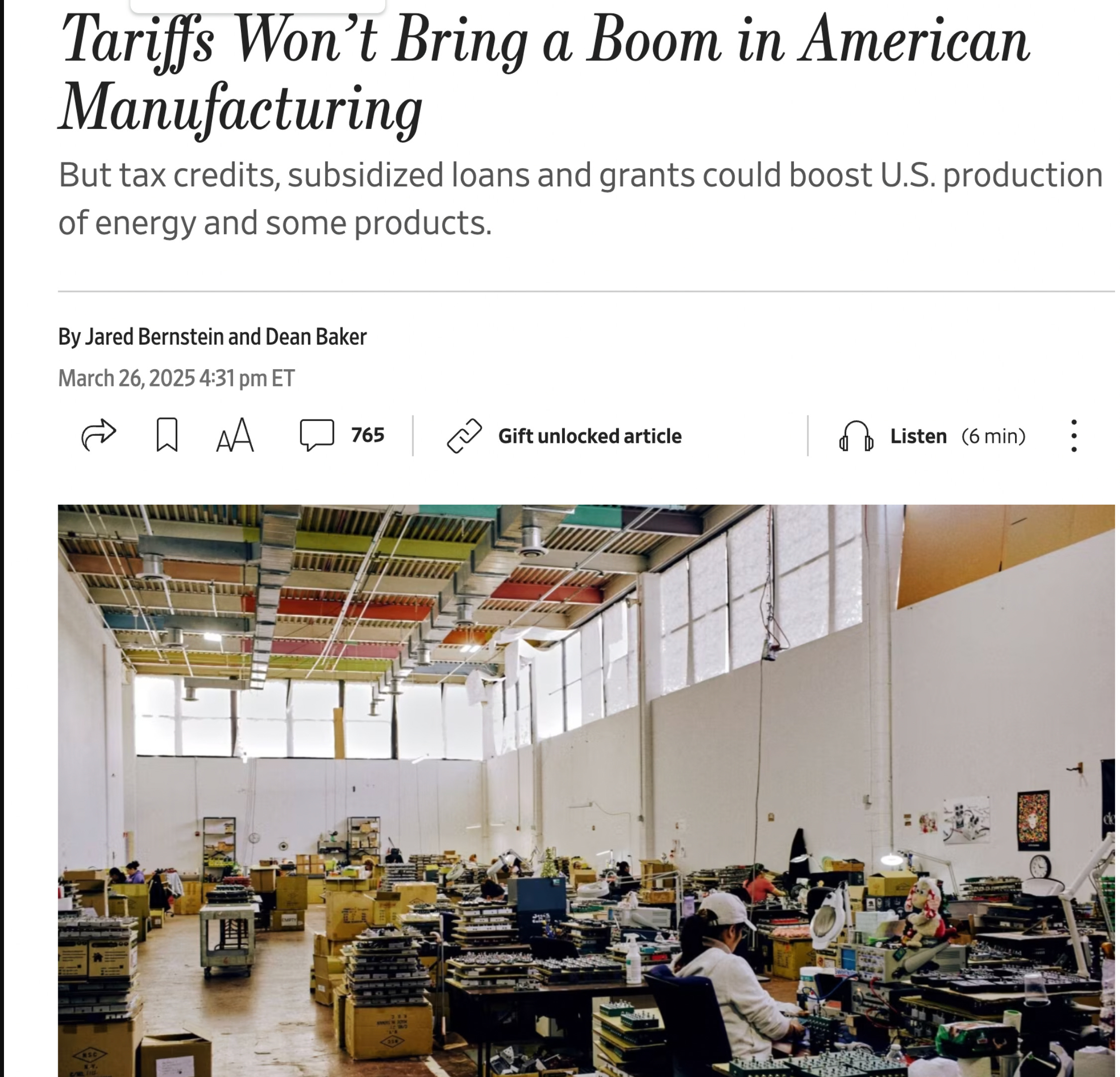Then why does Jared Bernstein, Chairman of the US Economic Advisors, 2023 - 2025, in his article “Tariffs Won’t Bring a Boom in Manufacturing,” published in the Wall St. Journal on March 26, 2025) state: