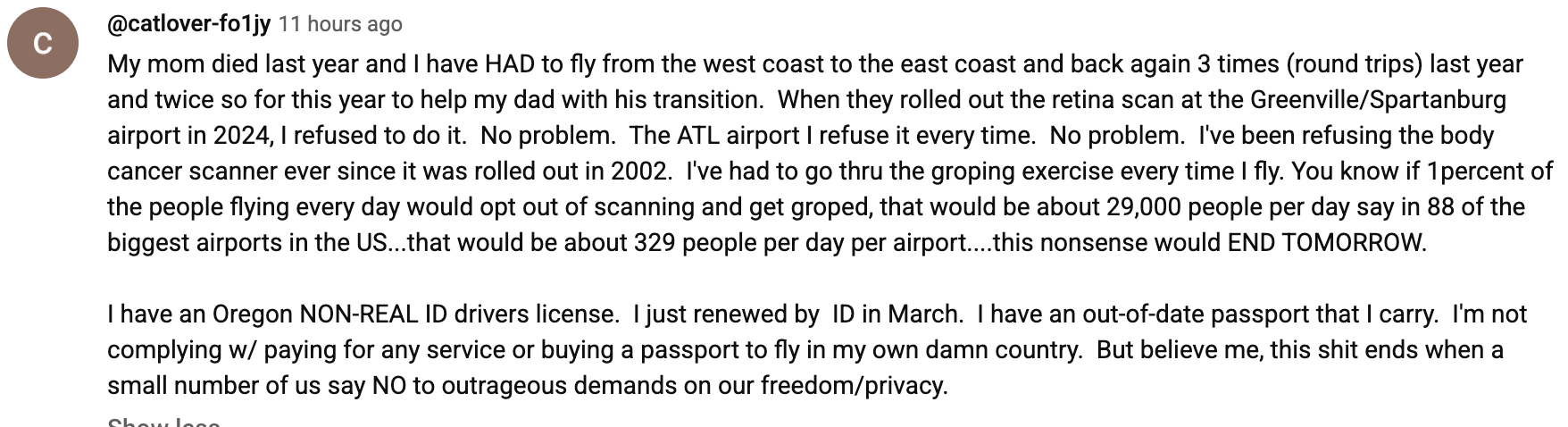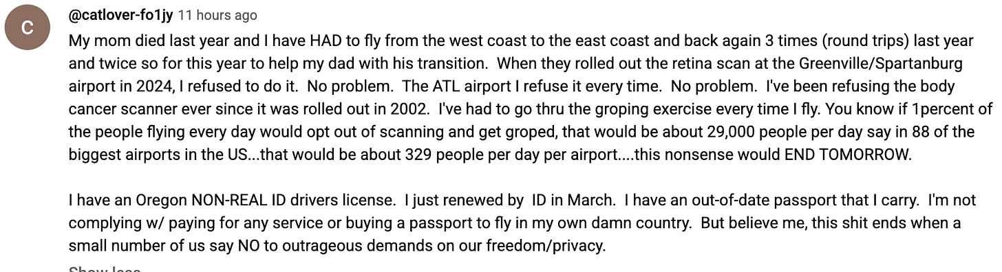 At the TSA podium I handed over my Real ID. You’d think that would suffice—after all, Real ID is supposed to “protect identity.” Nope. They wanted me to stand on footprints and face a camera for facial biometrics—measuring eyes, nose, mouth—“to verify” me. I declined. I stepped back, offered my ID, and said, “No thank you.” (They like you to say “I opt out”; I won’t parrot their language.) After the extra squinting—“Is it really her?”—they waved me through.