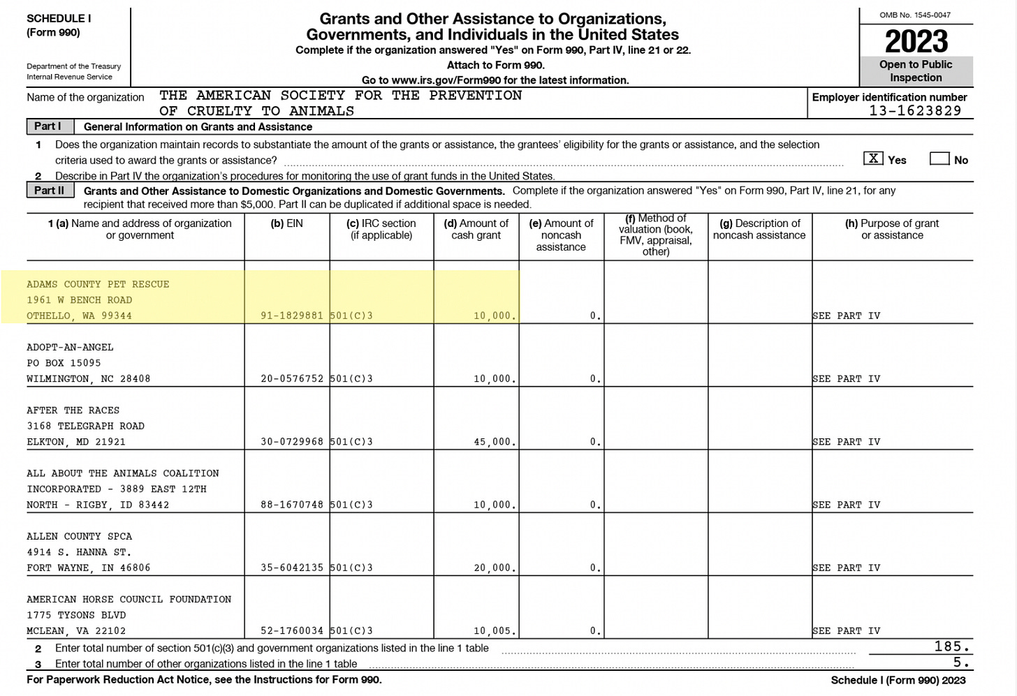 Next, you can scroll to Schedule I, where you’ll see where your donations went in terms of which rescue groups got how much money. There are several more entries than I’m showing you here, and the average grant looks to be about $10,000. That is ten thousand dollars. Looks like the ASPCA could bump that up to $100,000 per grantee and still have money left over if they budgeted correctly.