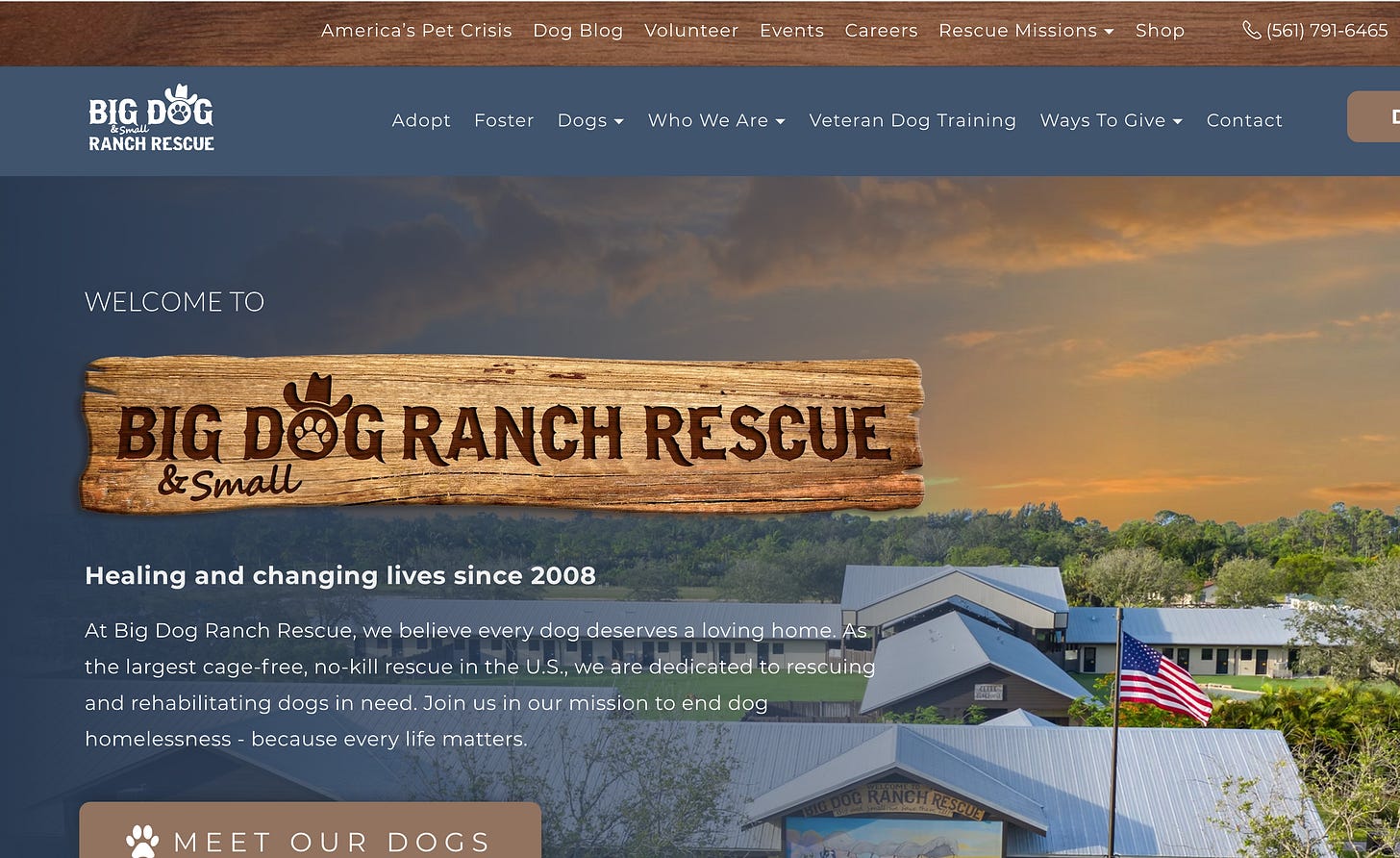 Big Dog Ranch Rescue — The largest no-kill, cage-free animal sanctuary in the U.S. They run on a fraction of the budget of those massive “brands” and still manage to care for thousands of animals. Total income for 2023: $13.8 million. Executive compensation: 0