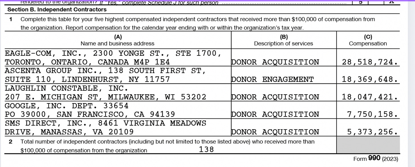 Next, under Part VII “B”, take a look at the contractors. Here, you can see that the ASPCA spent about $75 million to get more donors. (Remember those calendars I told you about? Some of those expenses would fall under this category.)