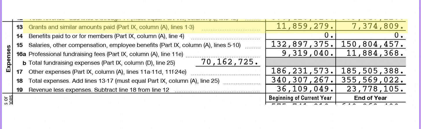 You’ll see their gross receipts — basically, how much money they brought in that year. Some of these numbers will knock your socks off. Here, you’ll see the ASPCA brought in nearly half a billion dollars in 2023.Then, take a look at how much of that money was actually spent on the programs you think or hope it did. Here, you’ll see that the grants paid out to help the animals amounted to $7,374,809 for 2023. I don’t even need a calcualtor for this — I can see that the ASPCA brought in nearly $500,000,000 (that’s 500 HUNDRED MILLION dollars) and just over 7 million dollars went to the animals. Hmmm…