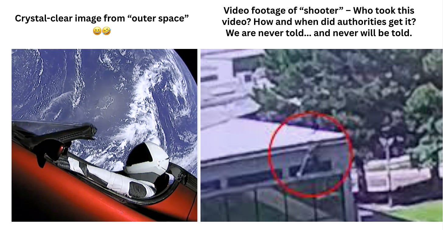 Also, video footage of the alleged shooter on a rooftop is released — but authorities never say where it came from, who filmed it, how it was verified as credible, why it took so long to release it, etc. How do we know it was not AI? Why is the footage of such poor quality when we are shown images of purported planets far, far away, yet video footage looks like this?