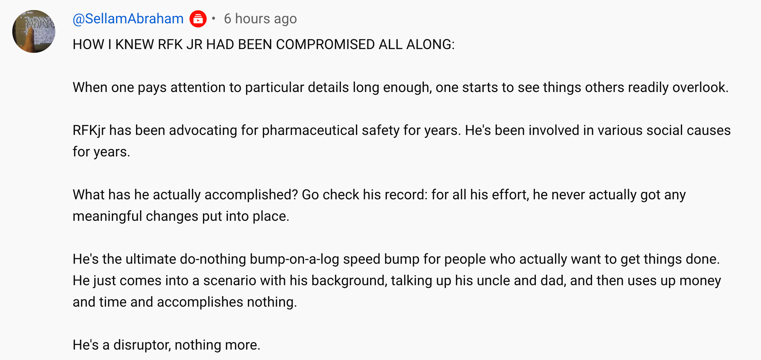 I just presented evidence to help people have facts when they were making their decision on who to support. I played several clips of RFK Jr talking and many people dismissed this evidence as me “putting words in his mouth.”